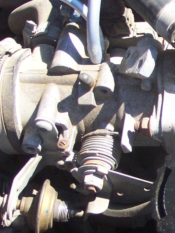 The shaft on the side of the body with the big spring on it is the throttle shaft.You can't see it, but underneath is the throttle position switch. It is supposed to read either "throttle fully closed" or "throttle at least a little open, maybe wide open, I just don't know". It is disconnected and there is a jumper on the two wires that are supposed to be plugged into it. (Damn previous owner!).